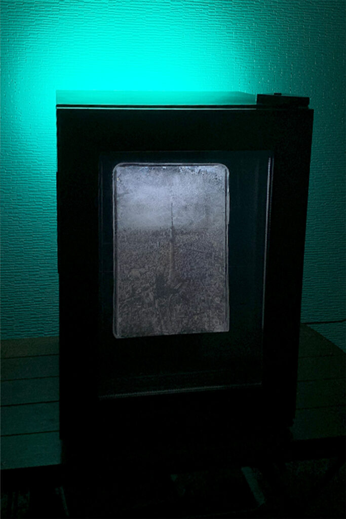 冷却装置という外部電源に依存して“延命”される氷を保存しようとする行為は、その儚さを奪うという逆説を示す。溶けゆくはずの氷を制御することで、現代社会のテクノロジー依存を静かに突きつける。本作は設計上、1週間以上の展示にも耐え、儚さと制御の緊張を観る者に残す。