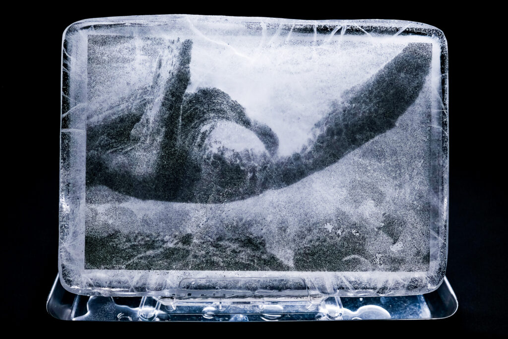 水槽でゆったりと泳ぐウミガメは氷の結晶に反射し、静寂の中で儚く浮かび上がる。触れれば溶けてしまうその姿は、生物としての脆さを帯び、まるで消えゆく記憶のように美しい。溶けゆく過程も含めて、時間と空間に封じ込められた“刹那の命”を映し出す儚くも力強い生命の記録である。