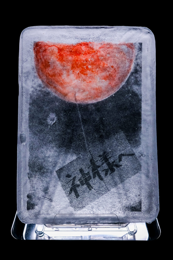 氷に閉じ込められた文字や線はやがて溶けて消えゆく。 流れ落ちる赤い食紅は苦しみや血の象徴として祈りを染める。 その儚さは願いが時間と共に形を失いながらも、確かに存在した痕跡として静かに語りかける。