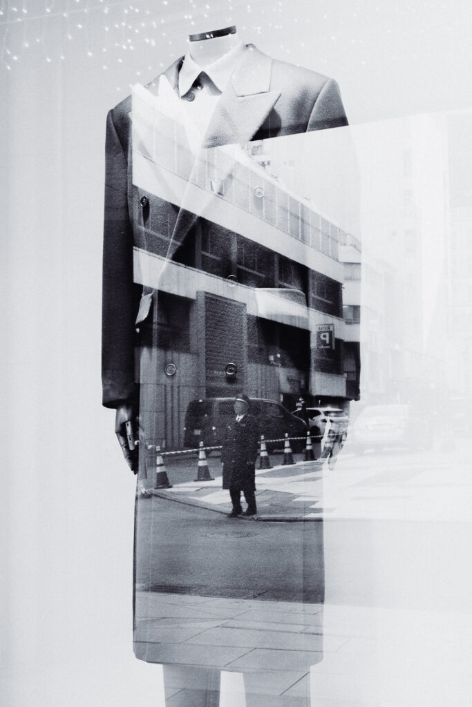 顔があるという当たり前の現実を写せないもどかしさを表現するため、作りこまれたショーケース内の首のないマネキンと顔を塗り潰した警備員を対比させた作品。